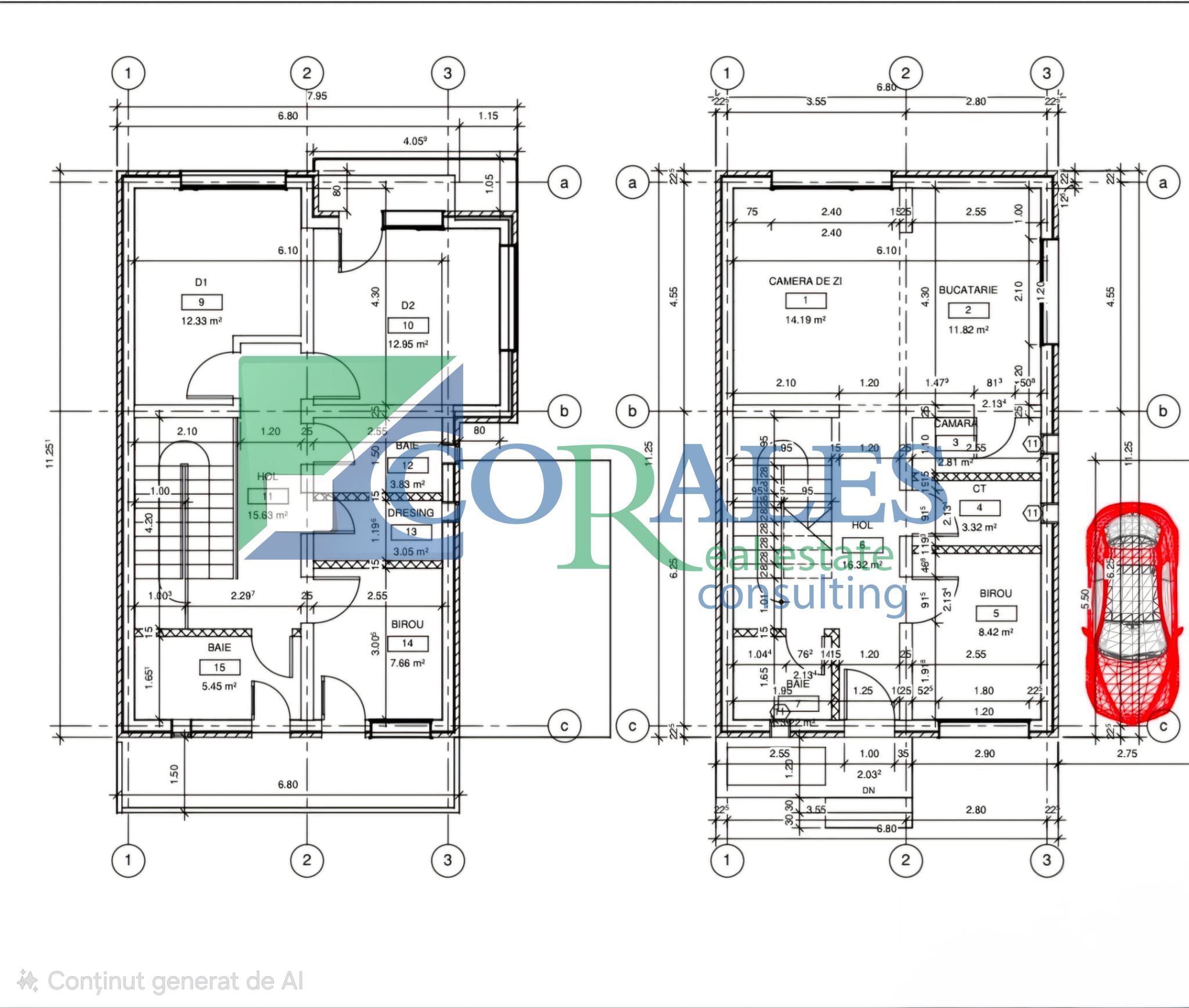 - etaj : hol acces, 3 dormitoare, 2 bai, dressing
