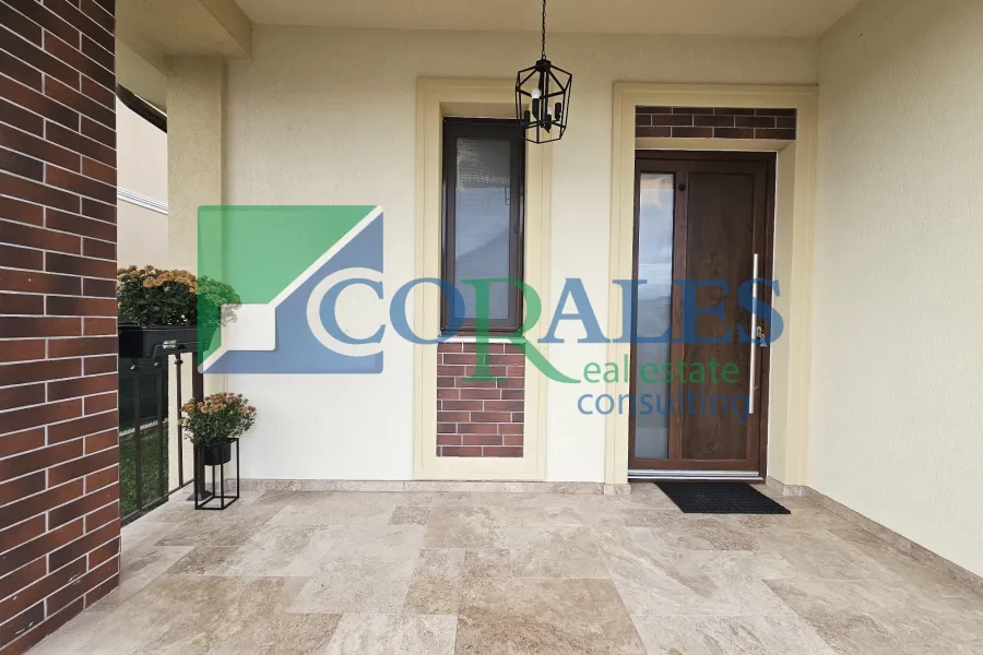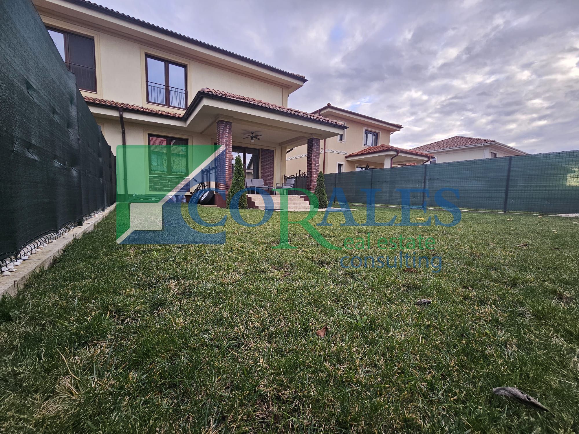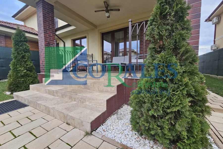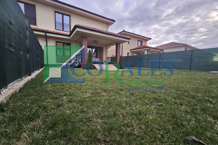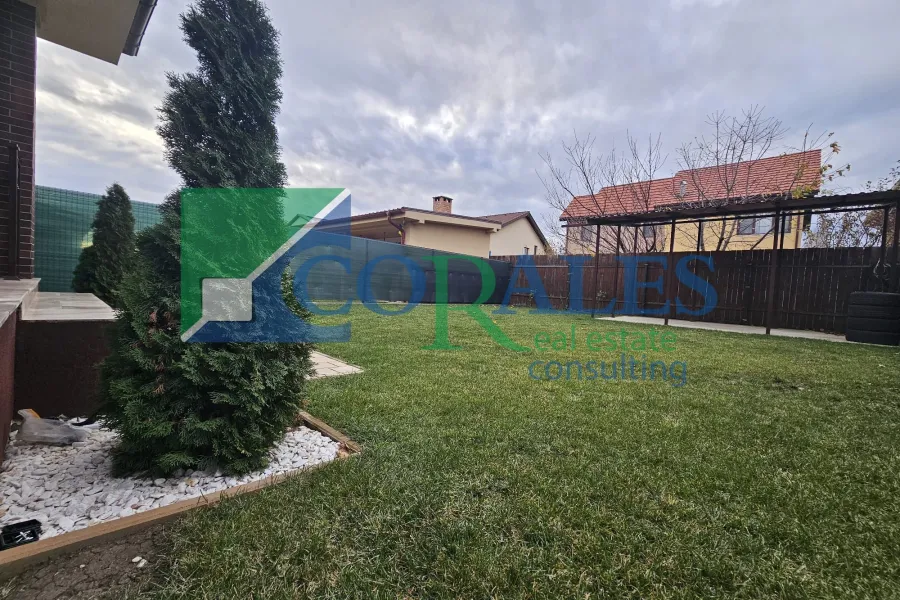 Gradina este amenajata cu gazon, plante decorative, foraj, alei pavate, corpuri de iluminat exterioare.