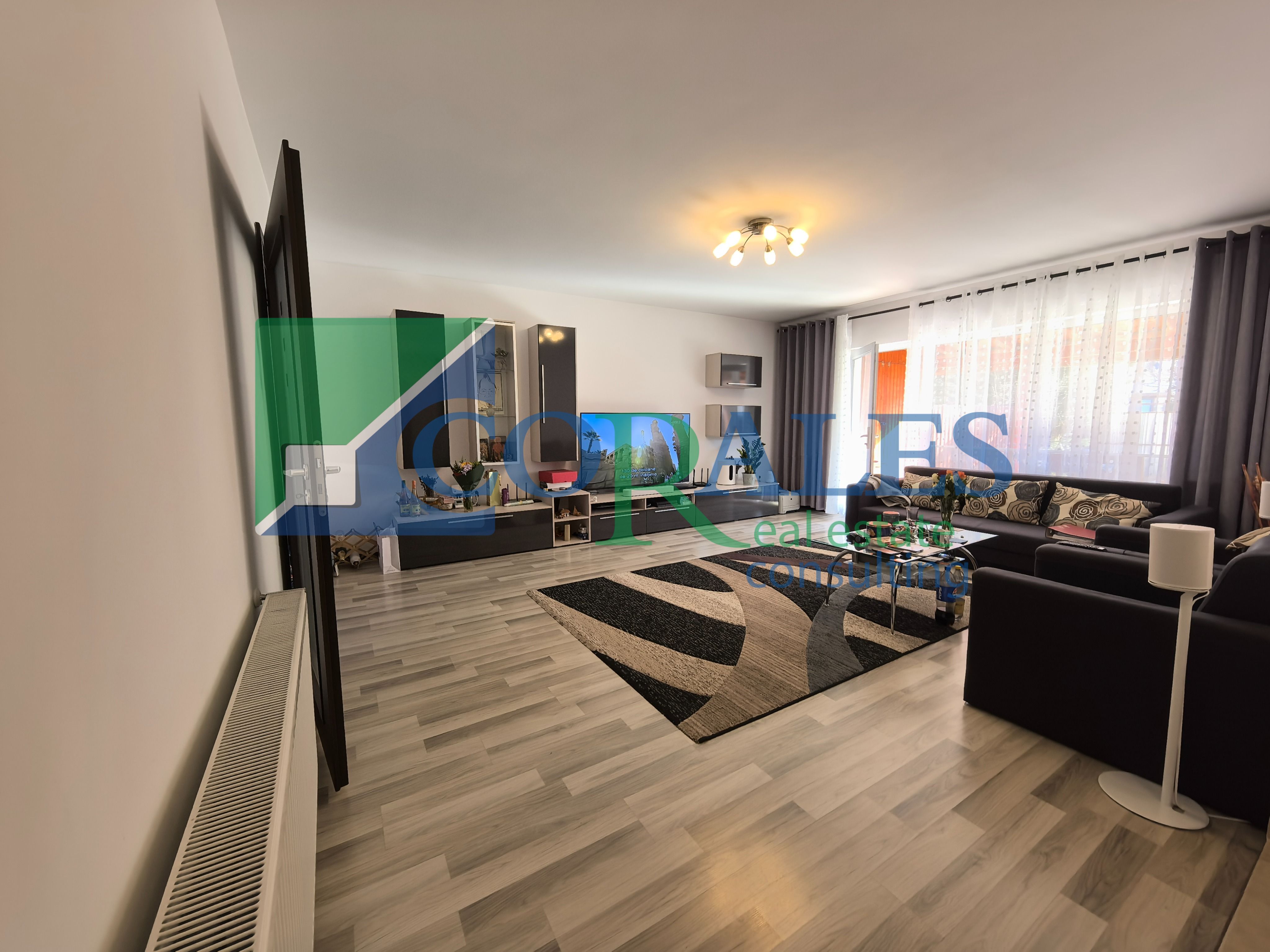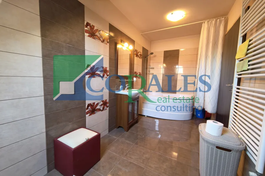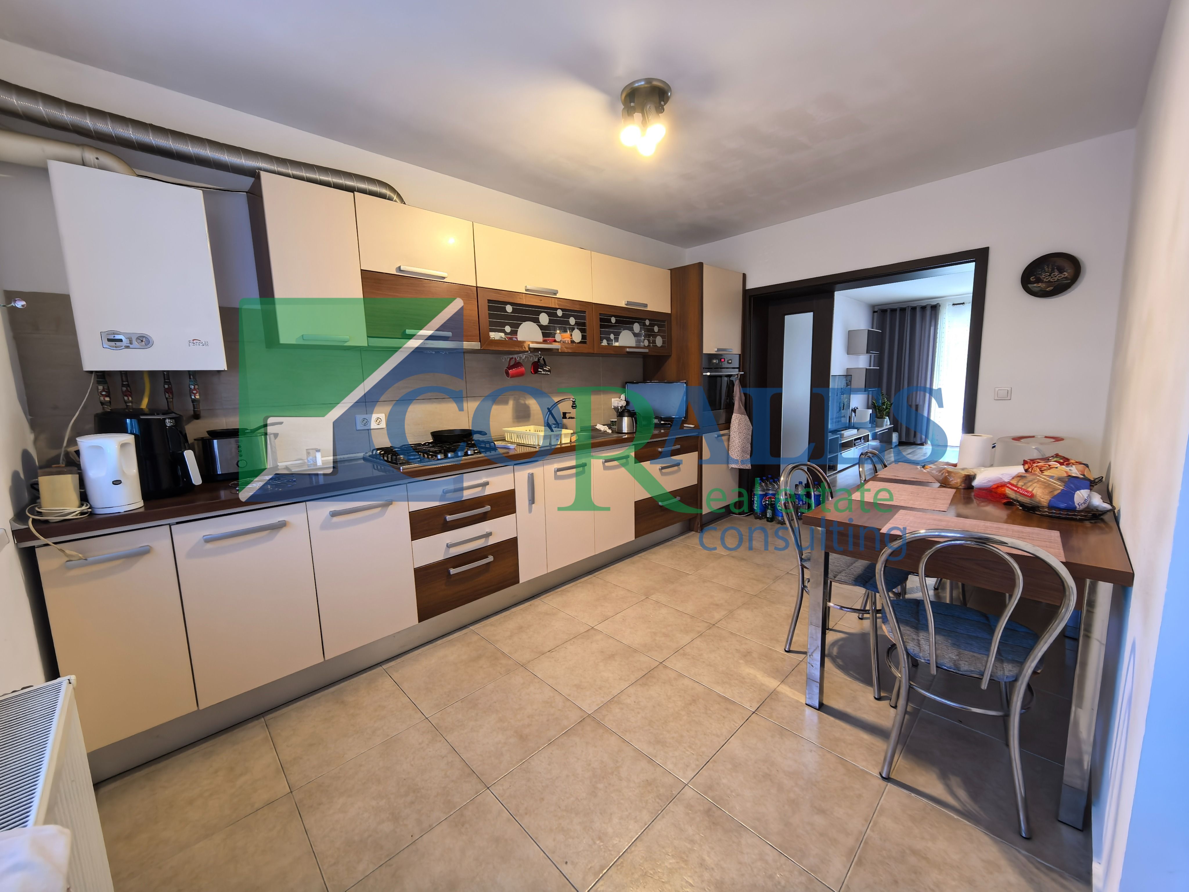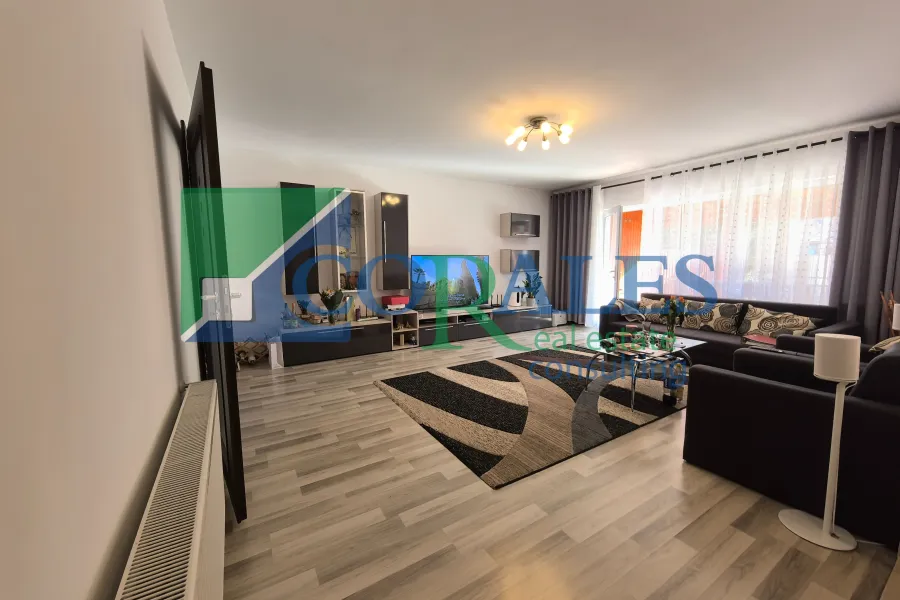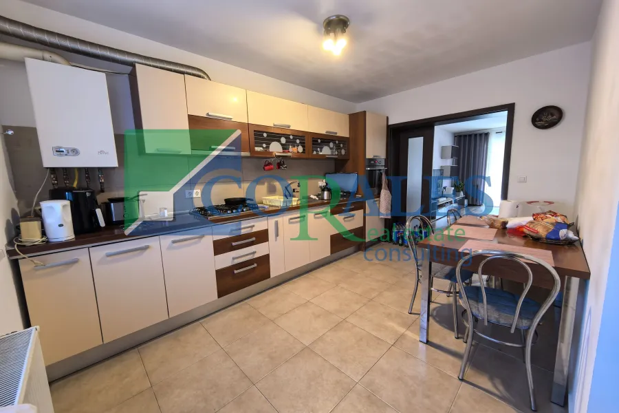 Amenajari si dotari: parchet laminat, gresie, faianta, tamplarie PVC cu geam termopan, usa intrare PVC, usi interioare noi, aer conditionat, centrala termica proprie, bucatarie complet mobilata si utilata (plita/aragaz, cuptor, hota, combina frigorifica, masa + scaune);