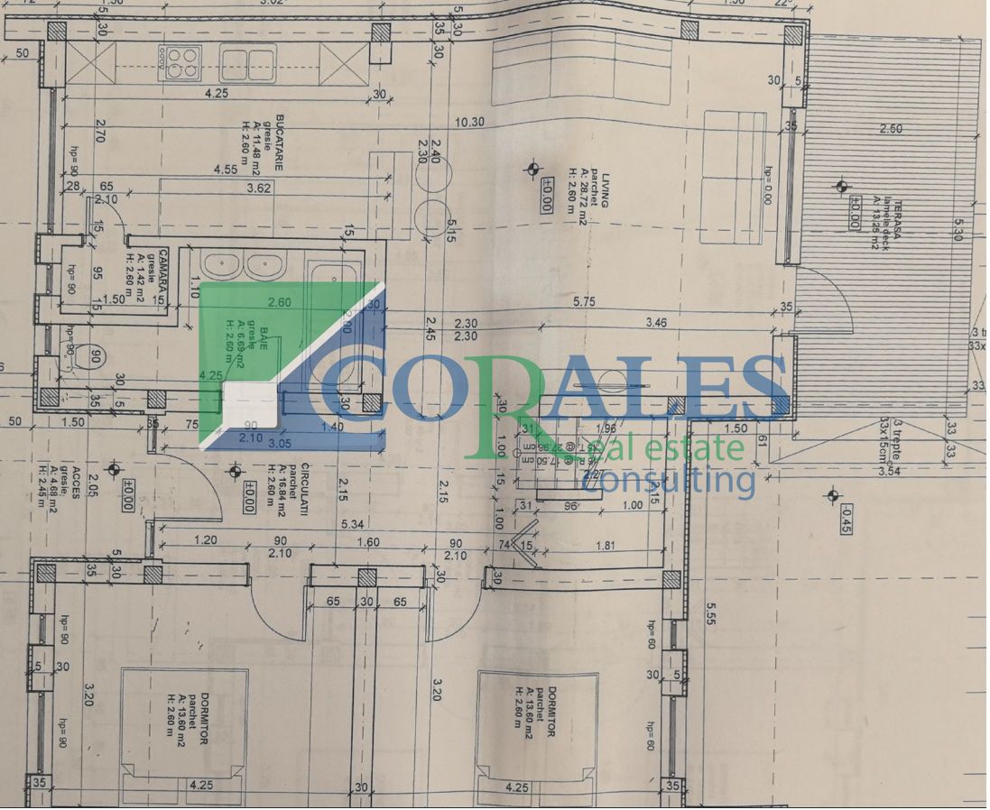 Parter: Hol acces, bucatarie + loc de luat masa, living, 2 dormitoare, baie, spatiu depozitare, terasa;