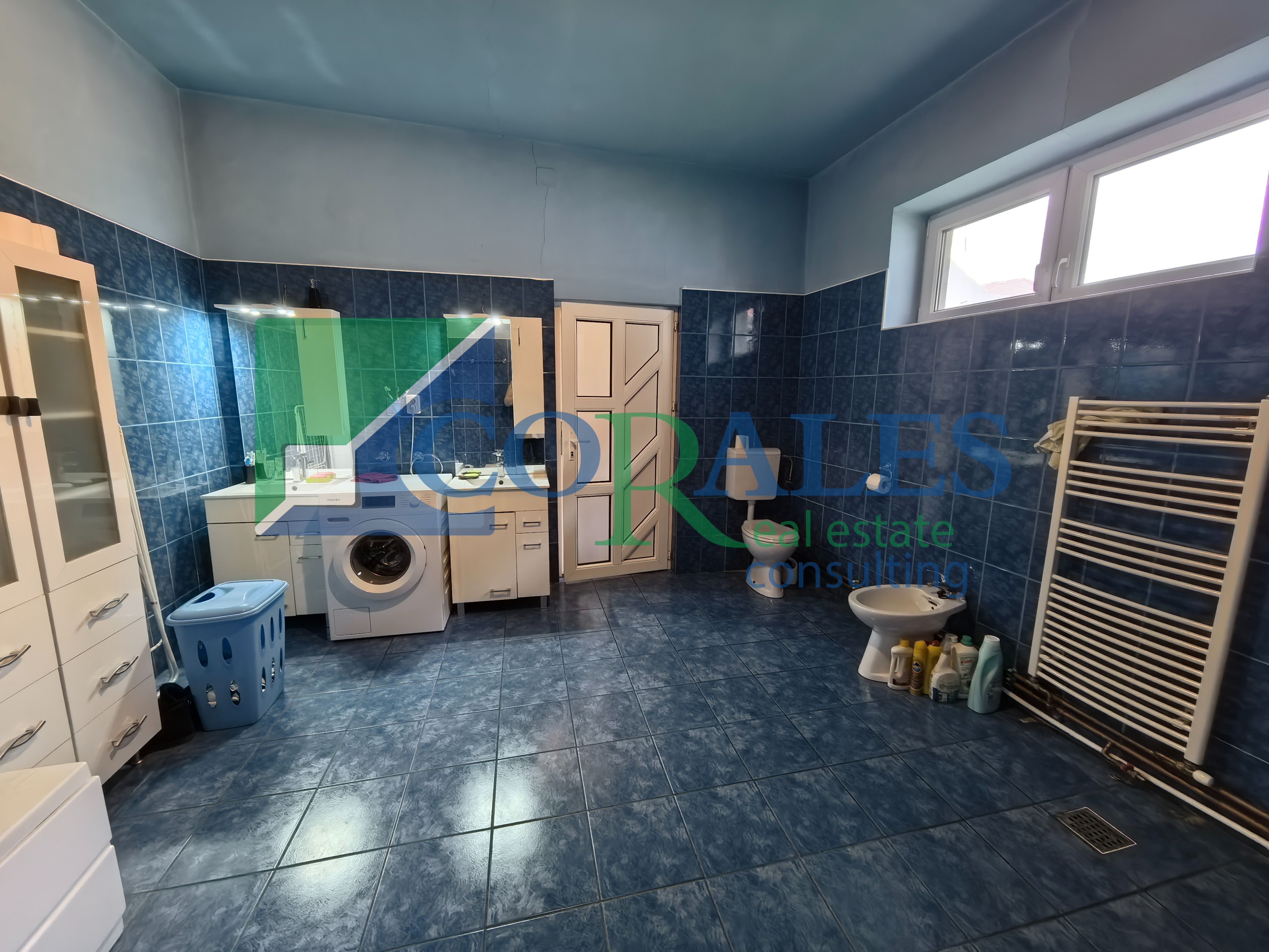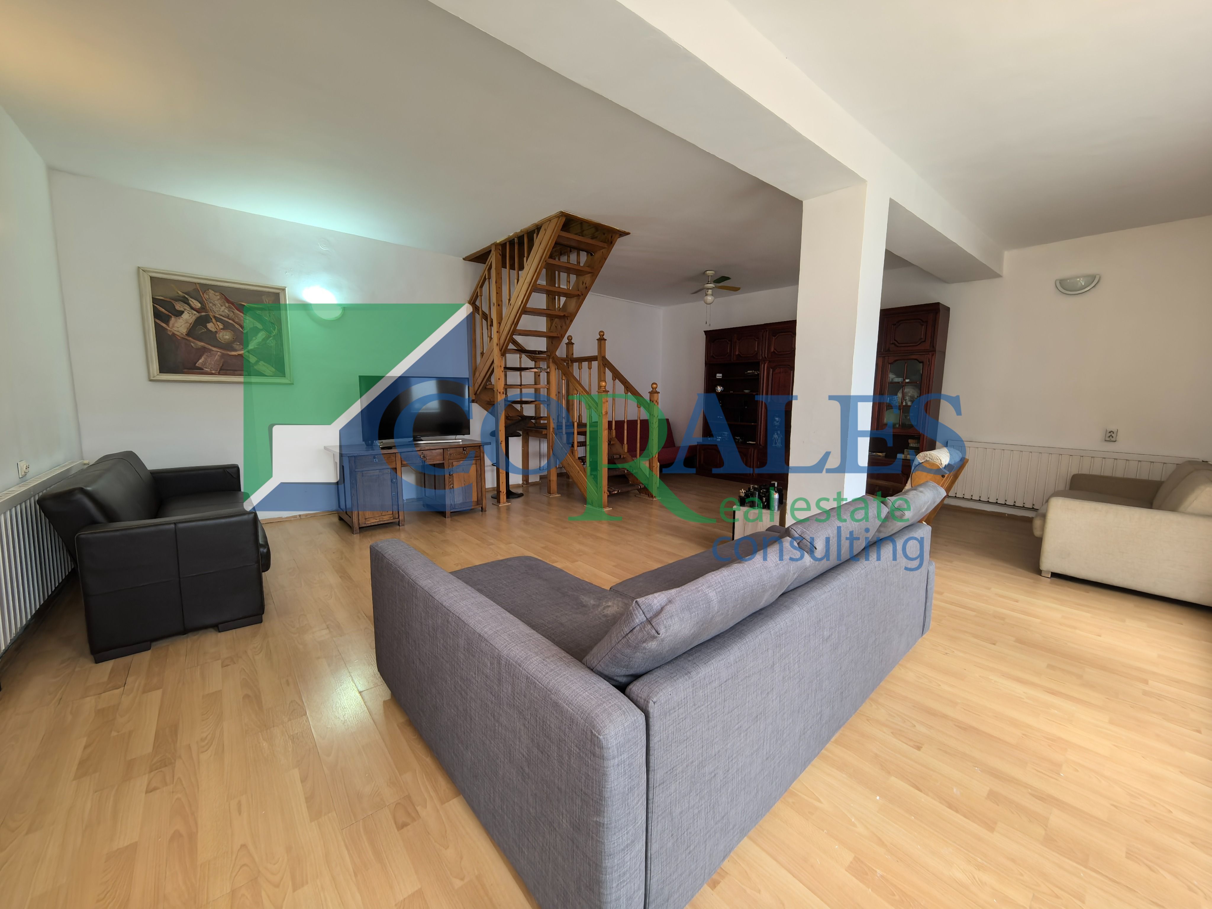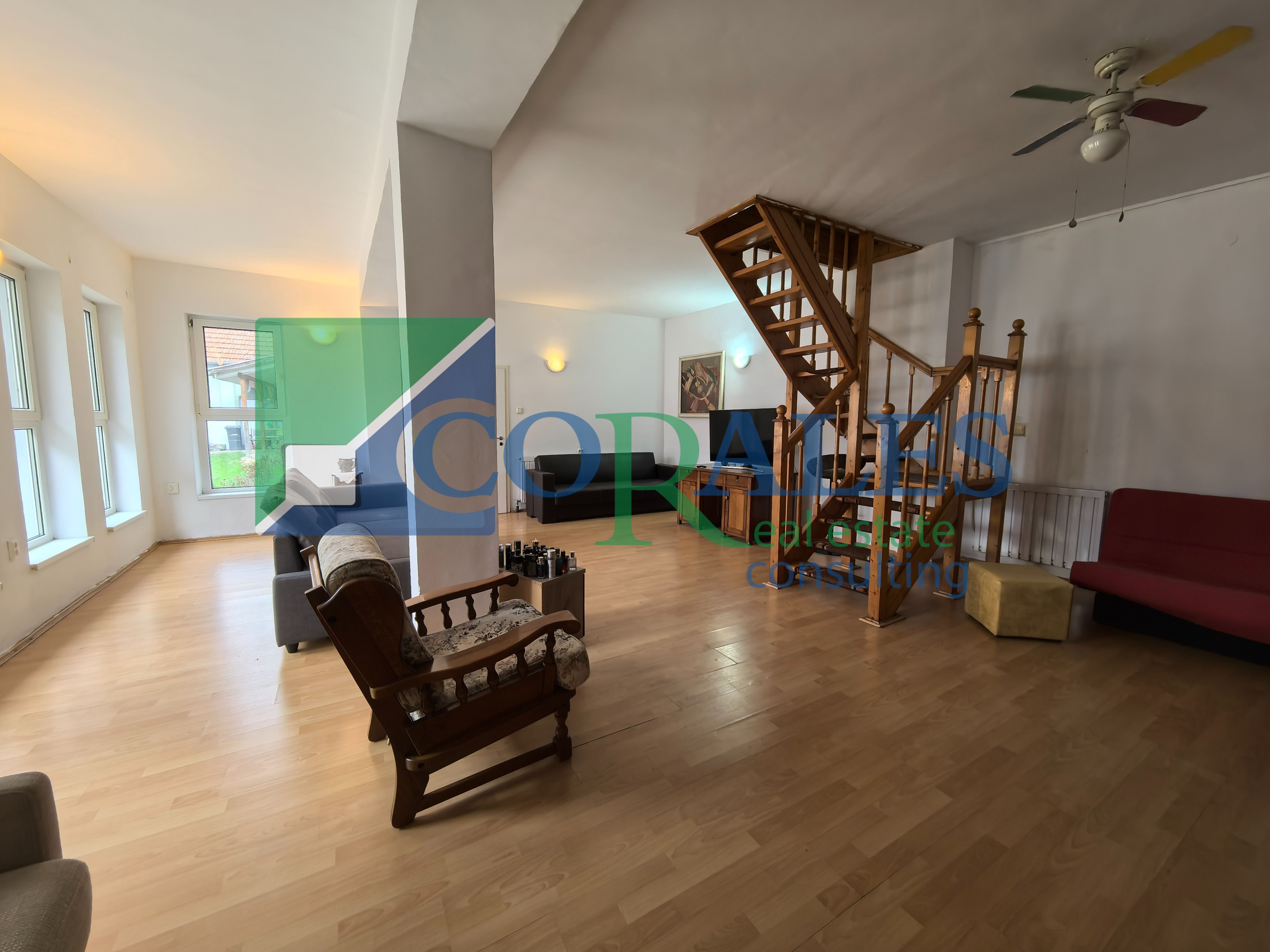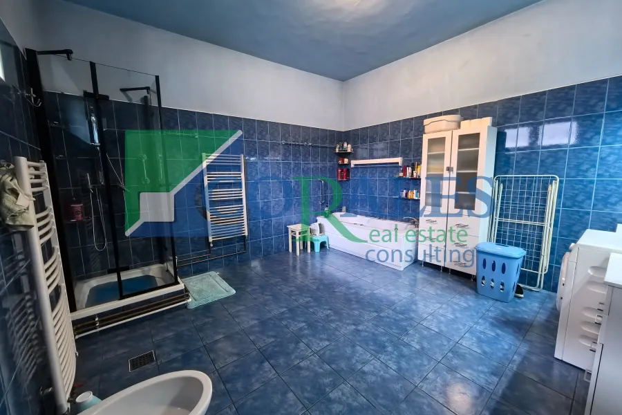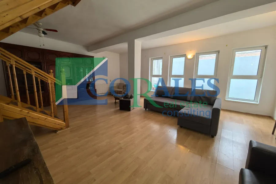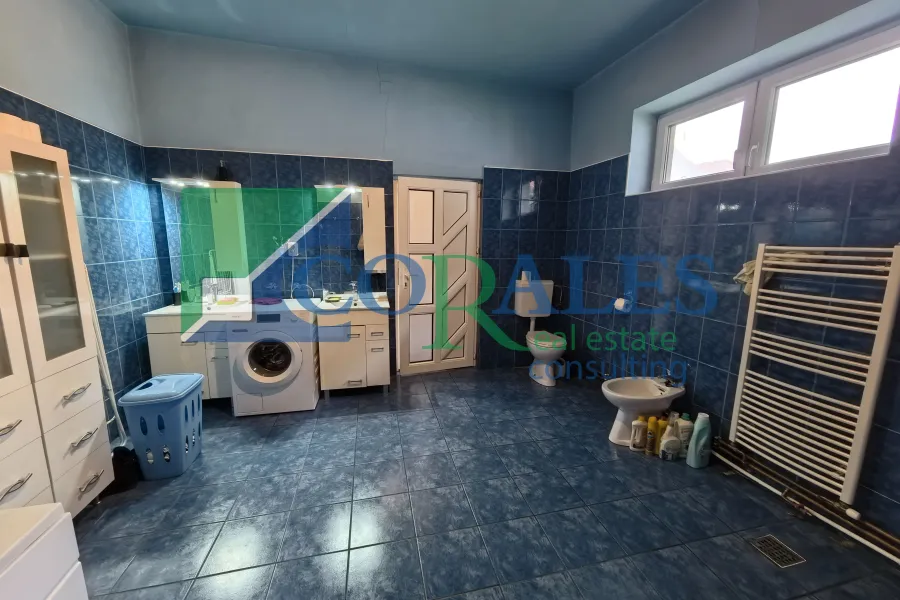Suprafata utila este de 205 mp, la care se adauga o terasa de 15 mp, iar terenul are 550 mp, cu front stradal de 10 ml. Constructia este realizata din caramida, termoizolata exterior, cu acoperis din tigla. Compartimentarea include la parter hol de acces, bucatarie cu loc de luat masa, living, 5 camere, spatiu de depozitare, 4 bai si terasa, iar la mansarda sunt 2 dormitoare.