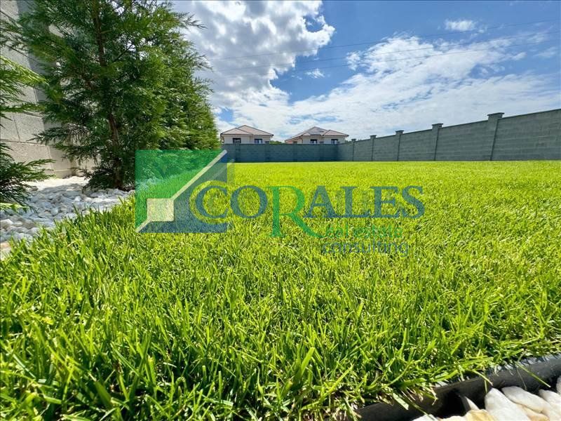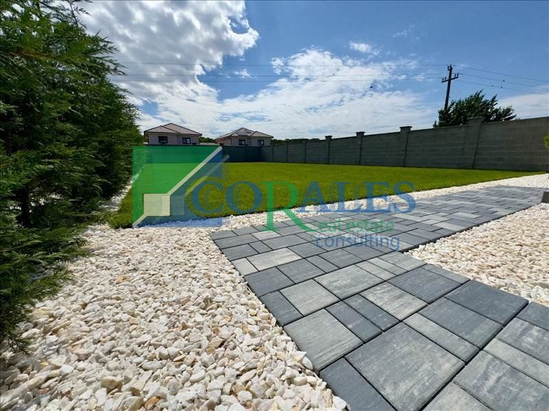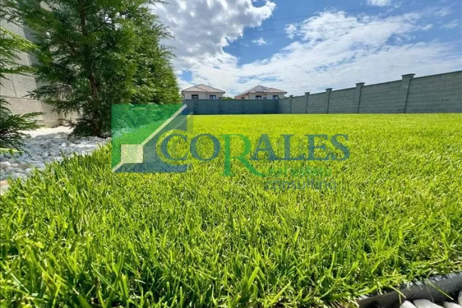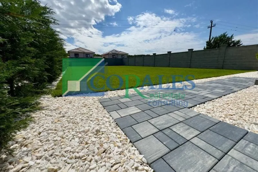 Gradina este COMPLET amenajata cu plante decorative, leylandi, sistem de irigatii automatizat, foraj, corpuri de iluminat exterioare, gazon, pietricele decorative.