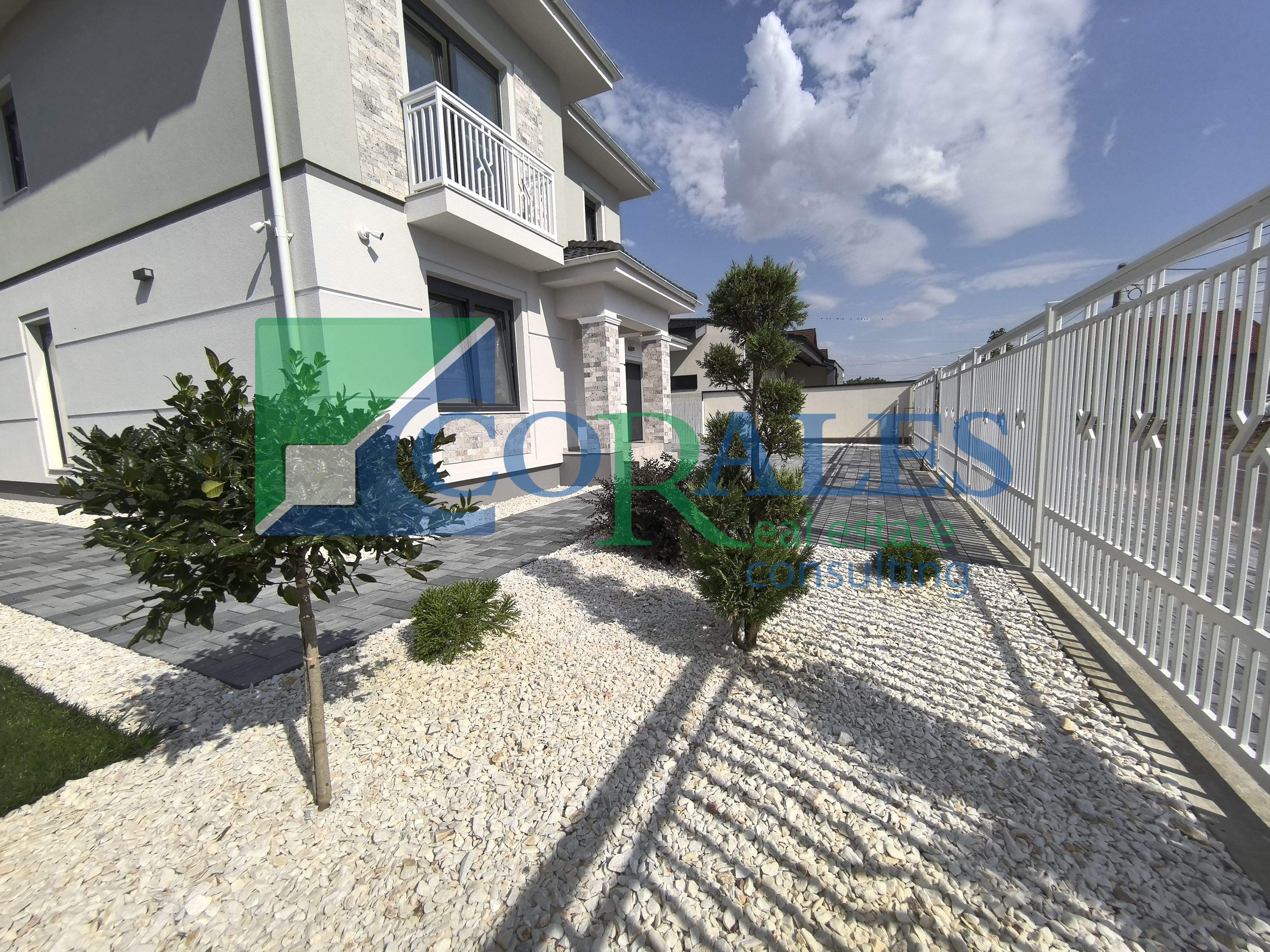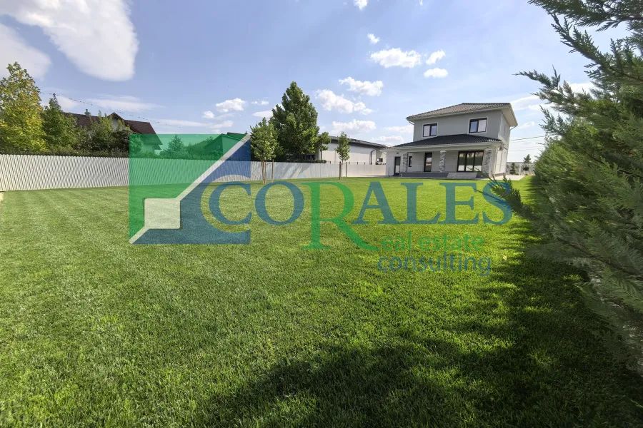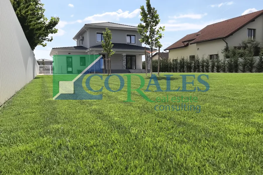 Gradina este COMPLET amenajata cu plante decorative, leylandi, sistem de irigatii automatizat, foraj, corpuri de iluminat exterioare, gazon, pietricele decorative.