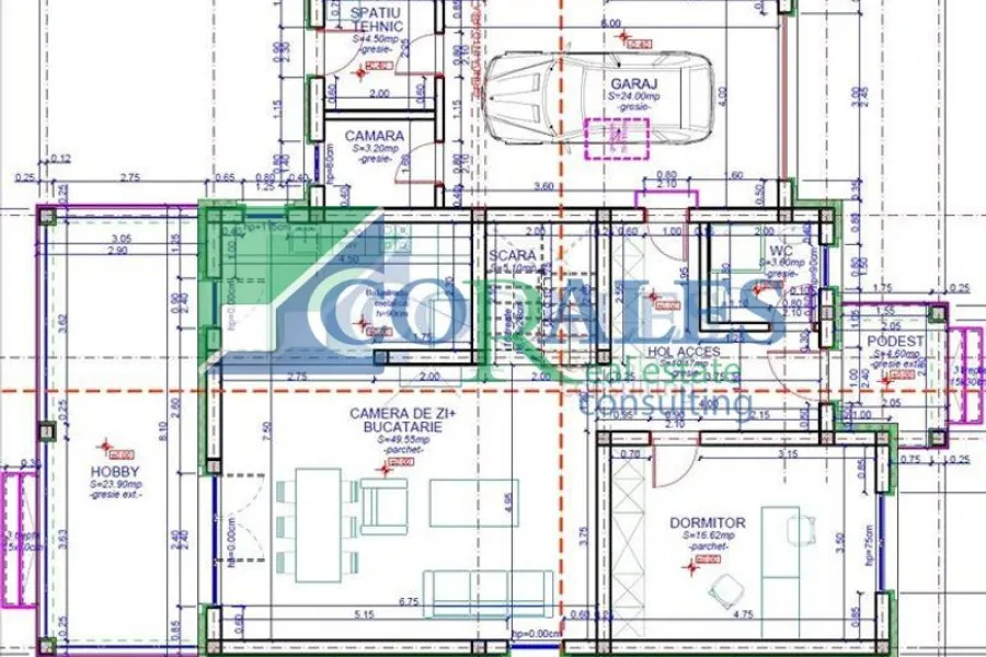- parter : hol acces, bucatarie, loc de luat masa, camera de zi, dormitor, spatiu depozitare sub scara, camera tehnica, camara, baie, terasa incalzita cu termostat de ambient pentru reglarea temperaturii, garaj incalzit cu termostat de ambient pentru reglarea temperaturii.