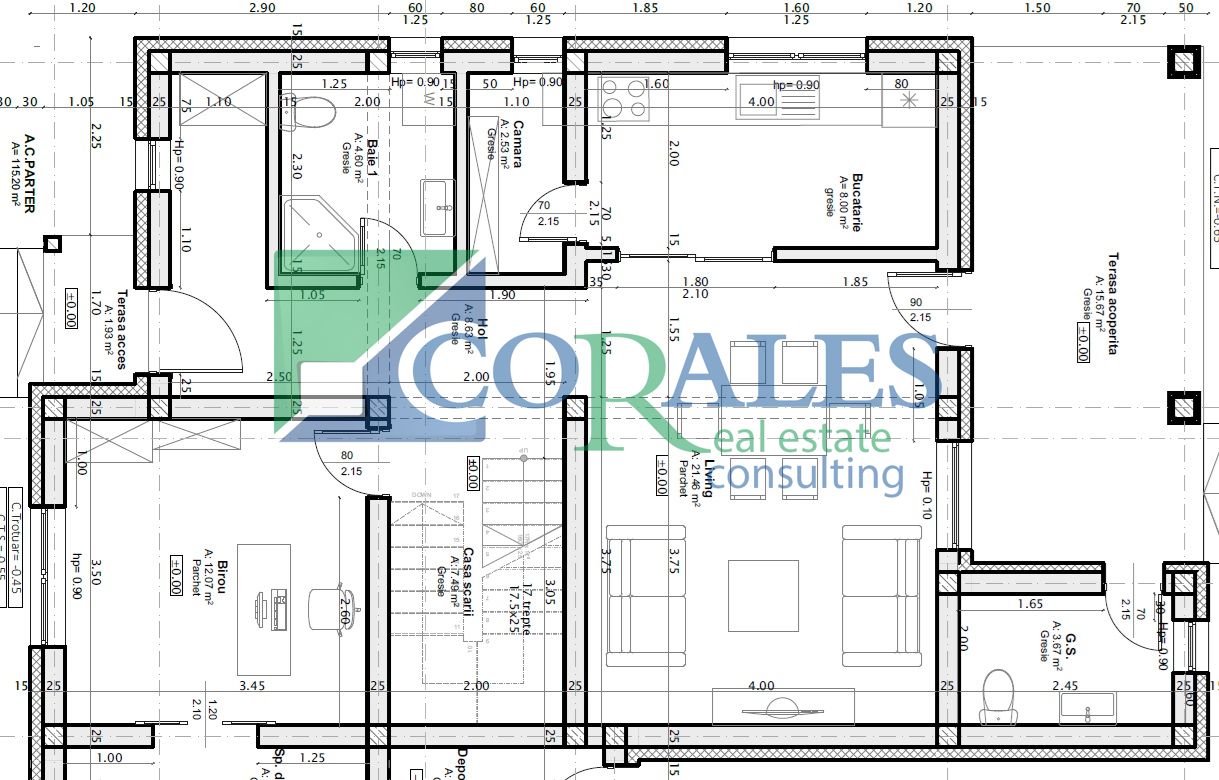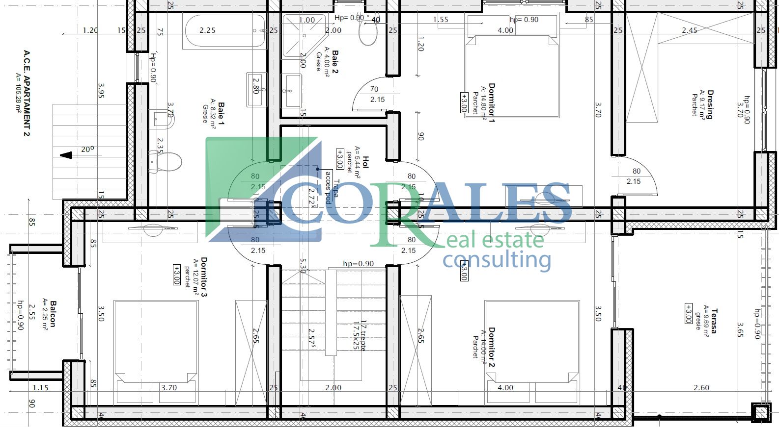 • Etaj: hol de acces, 3 dormitoare, 2 bai, dressing, balcon de 8 mp;