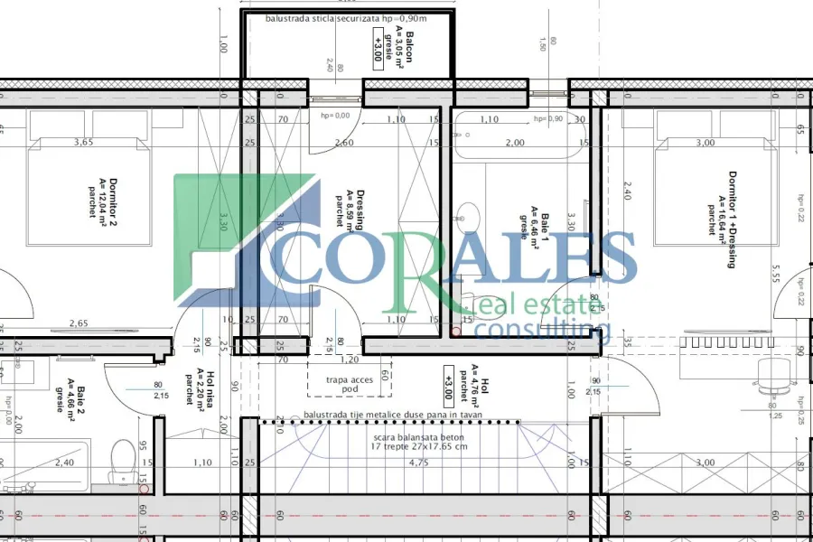 Etaj (Zona de noapte): Dormitor Matrimonial: 19,20 mp cu baie proprie, dressing si acces la o terasa privata acoperita de 10,92 mp. Dormitor 2: 16,64 mp cu balcon si acces la o a doua terasa acoperita de 16,26 mp. Spatiu Versatil: O incapere de 9 mp ce poate servi drept al doilea dressing sau birou. Baie Principala: 4,56 mp.